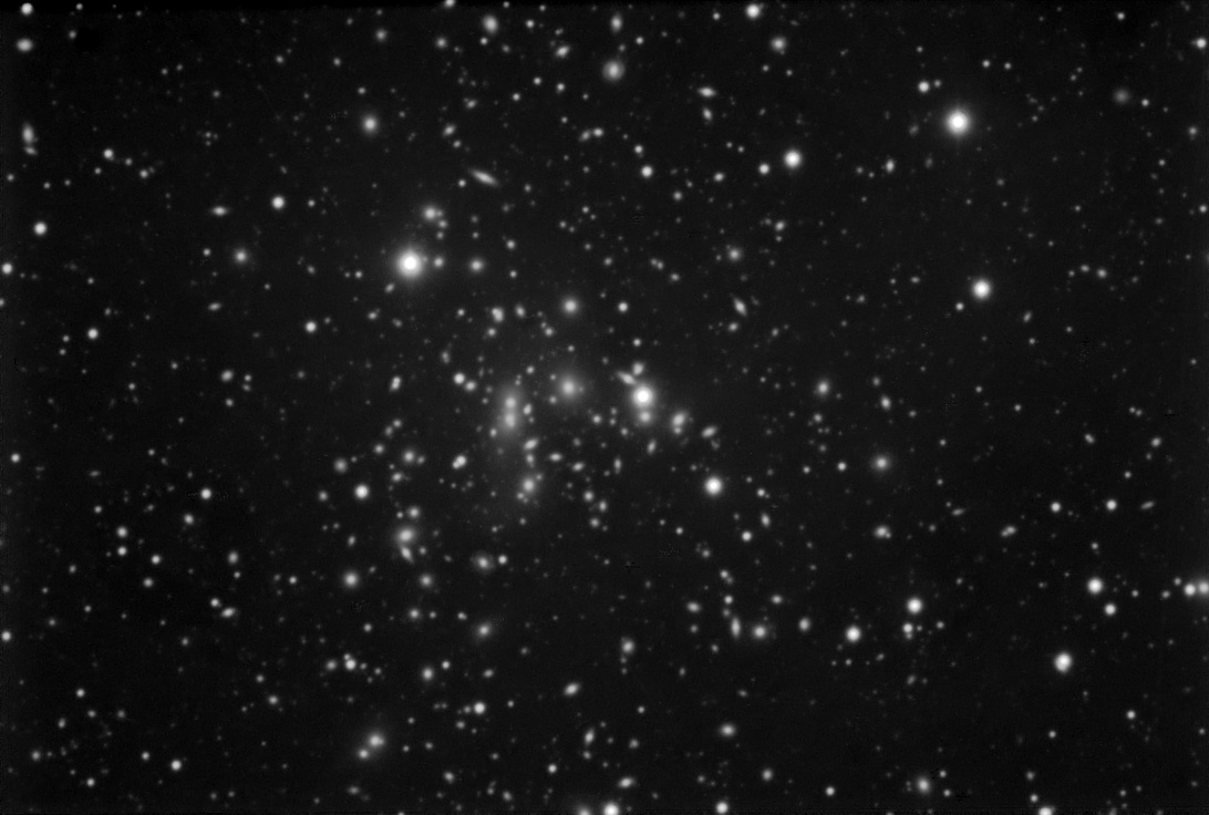 Click on the image for a full-resolution verision. Abell 2065 is a cluster of galaxies located at a distance of about 1 billion light-years, and contains over 400 galaxies. PCG 54883 is the brightest galaxy, left of center, at magnitude 15.9. Equipment: Meade